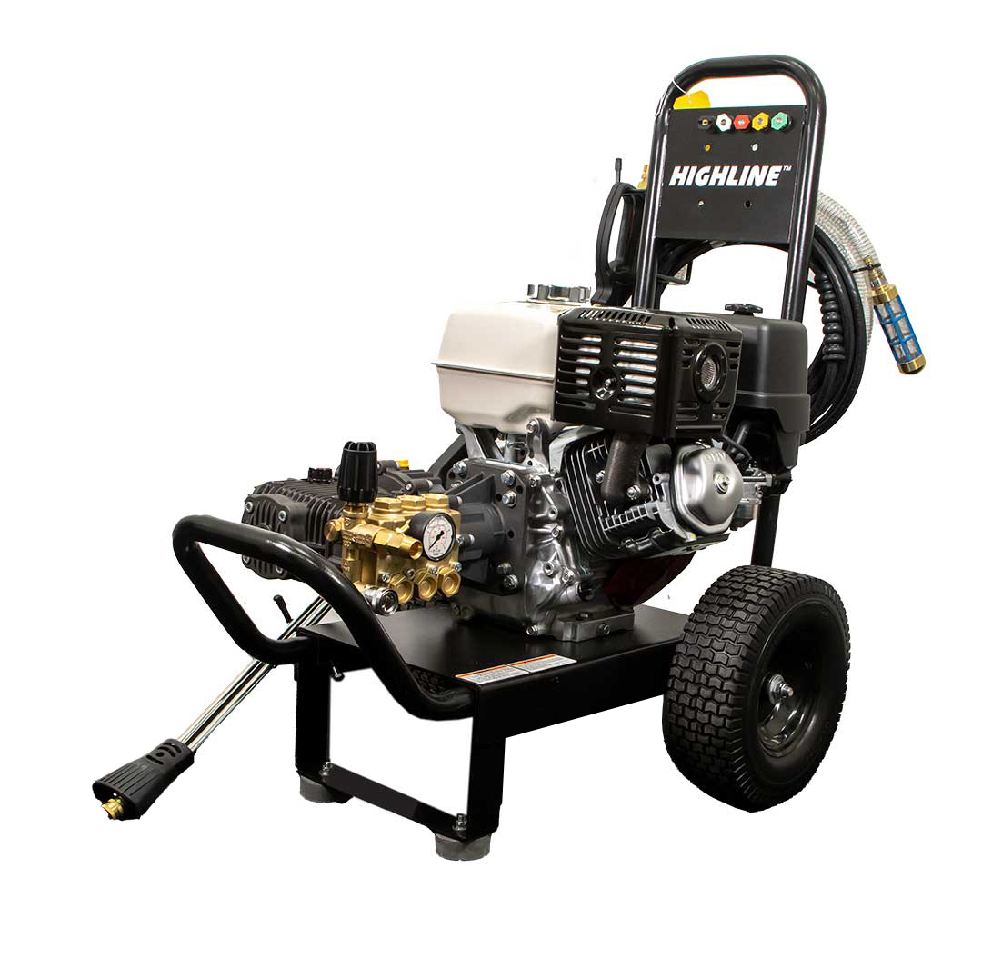 Using the quiet, powerful, and reliable Honda GX490 petrol engine coupled via a gearbox to an Italian Comet water pump, plus industrial grade dual lance, hose and other hardware means that this petrol pressure washer Honda is popular for commercial cleaning work with flat surface cleaners.